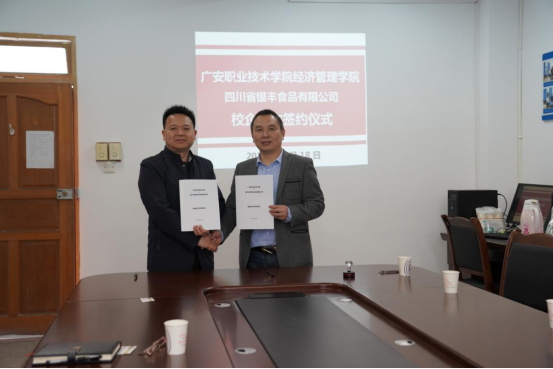 11月18日上午,广安职业技术学院经济管理学院与四川省银丰食品有限公司-岳池米粉电商订单班项目合作签约仪式在明德楼213会议室举行。这是经管学院电子商务专业首个与地方企业共建电商订单班的模式。经管学院院长文卫、副院长谭燕、教学科科长邓小辉、电商物流教研室主任徐娟、营销教研室主任沈婷婷,银丰食品有限公司负责人许辉等出席本次仪式。