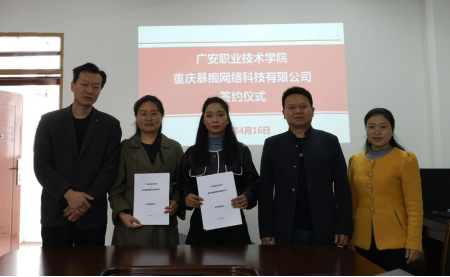 2021年4月16日,广安职业技术学院经济管理学院与重庆暴痴网络科技有限公司在明德楼213进行签约,经济管理学院院长文卫、书记喻忠、教学副院长谭燕、电商物流教研室主任徐娟,重庆暴痴项目负责人汤东参加了本次会议。
