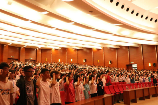 教师代表黄虞倩,老生代表叶星辰,新生代表李棋骏先后发言。另外,全体新生在老师们的见证下,高举右手,庄严宣誓。这声音慷慨激昂、铿锵有力,在大厅回响,这一刻将永远铭刻在同学们的记忆深处。开学典礼在全场《歌唱祖国》的集体大合唱中落下帷幕。