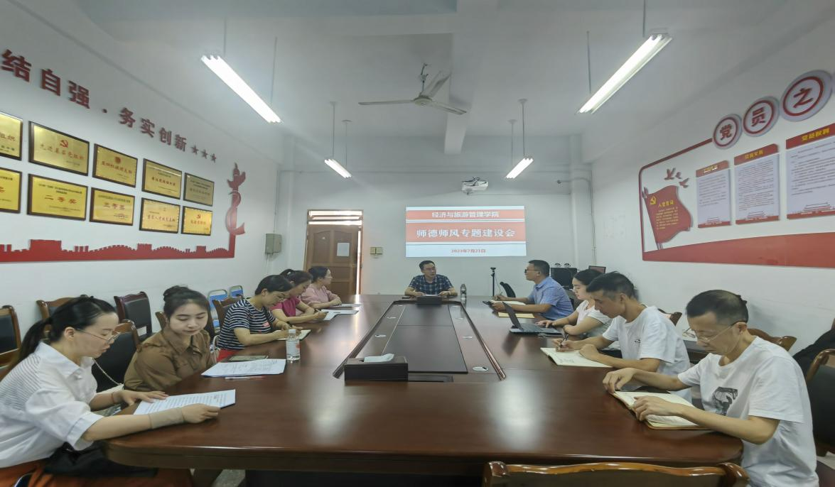 教育为本,师德为先。7月19日下午,经济与旅游管理学院学院召开师德师风建设专题会议,会议由院长晏榆洋主持,学院副院长邓小辉出席会议,在校教师参加会议。