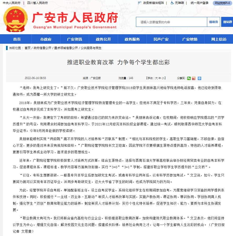 广安市人民政府:推进职业教育改革 力争每个学生都出彩